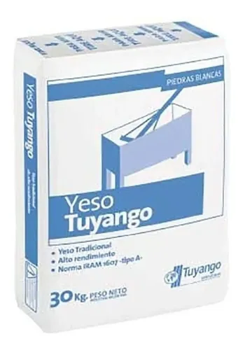 Yeso Tuyango Tradicional 30 kg Transforma tus espacios con el Yeso Tuyango Tradicional, diseñado para enlucidos manuales que buscan una terminación impecable. Con un tiempo de trabajo de 7 minutos y un rendimiento de 3-4kg/m², este yeso garantiza eficiencia y calidad en cada aplicación.